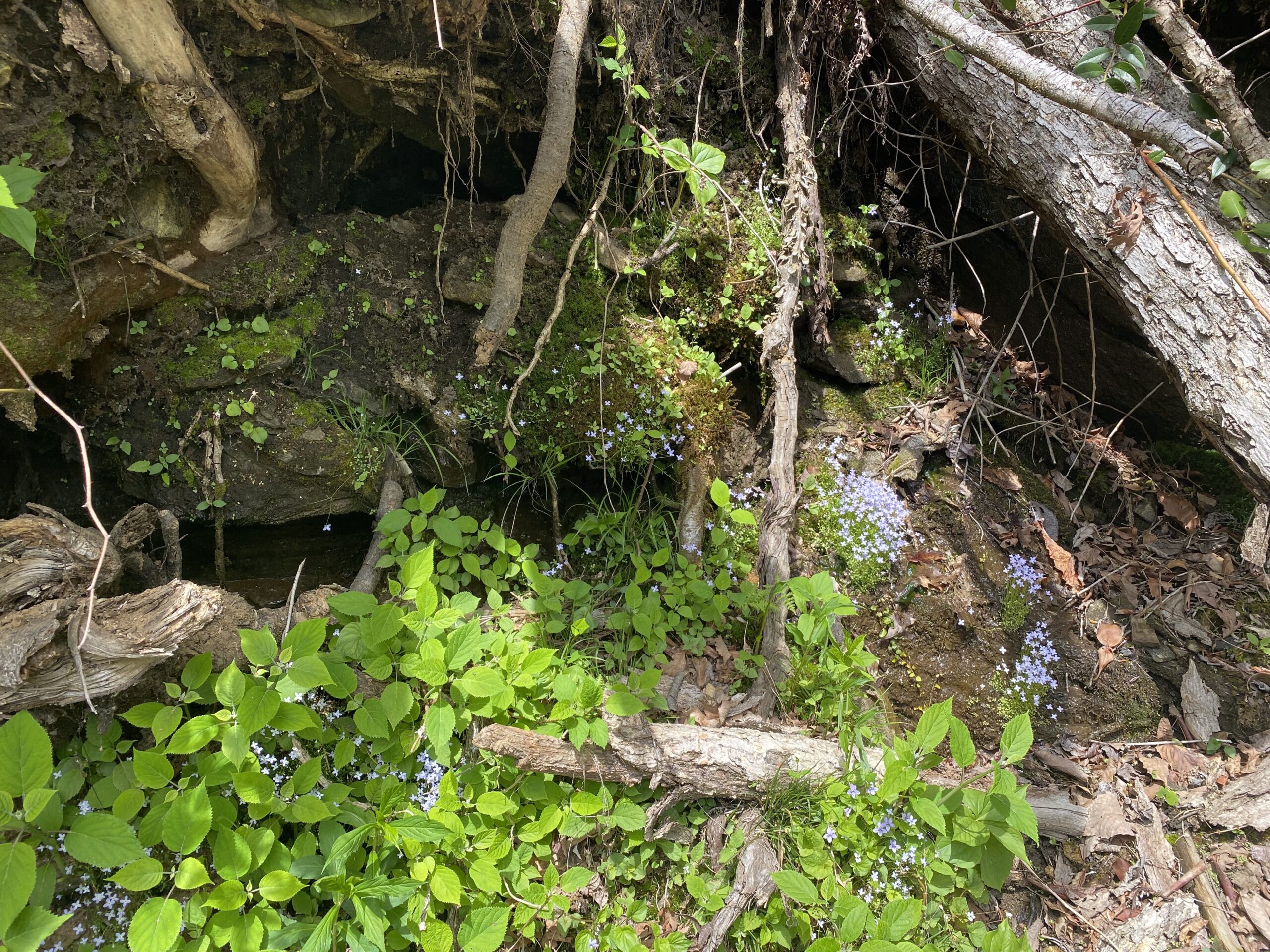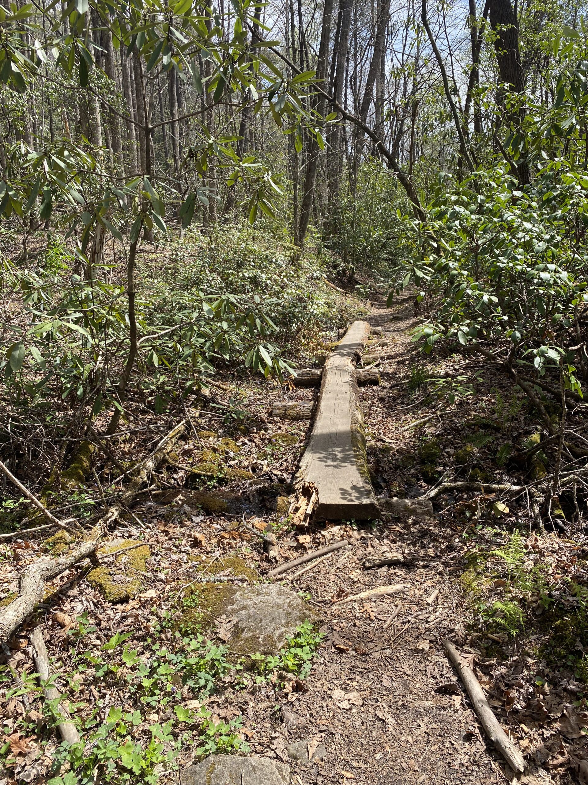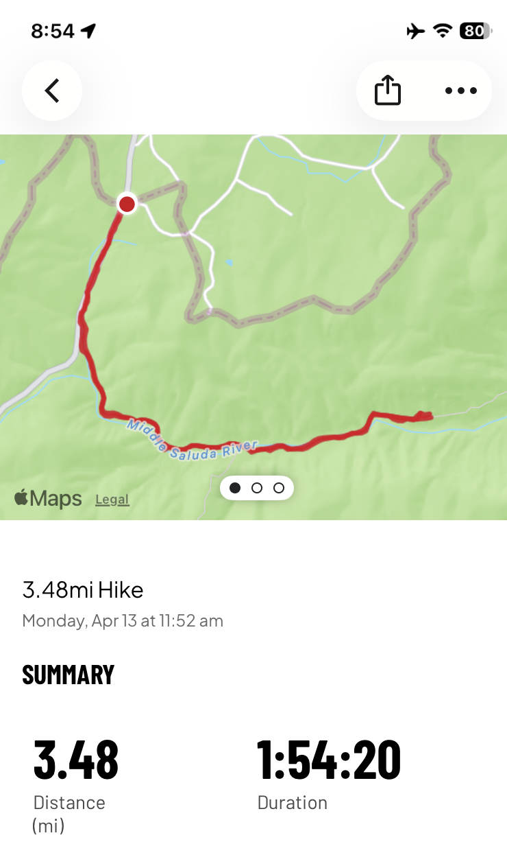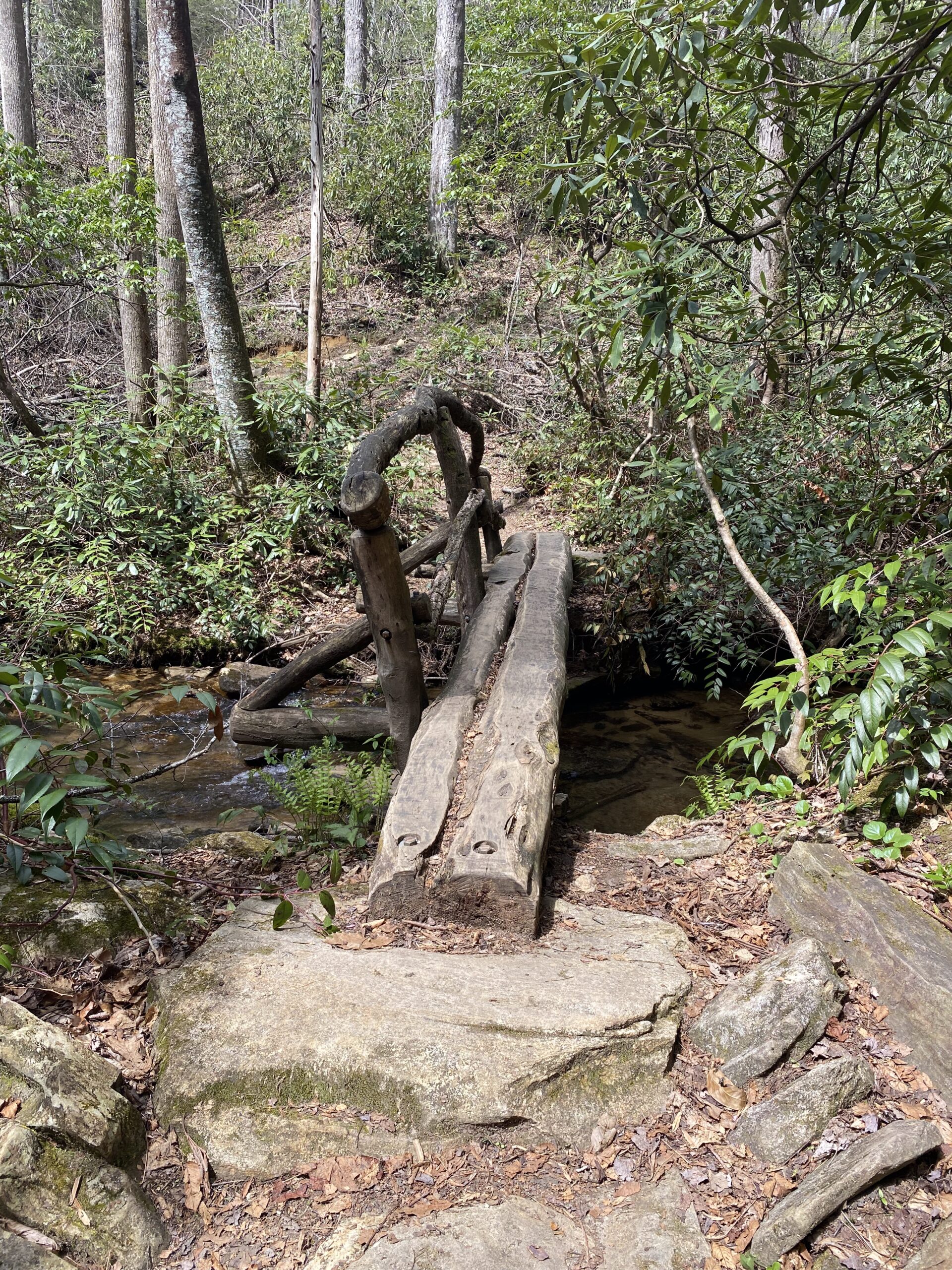 This entrance is rugged and it is a climb back up. Recent rains have rutted it quite a bit. I love going in this way because it is close to the headwaters of the Middle Saluda. I love hiking this trail because you get to watch the river grow and you get to hear the water as you hike. It is heavenly. There are so many wildflowers in the gap. We love to hike in late April and early May to see how many we can find.